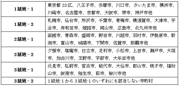 級地区分は、1級地-1から3級地-2までの6つに分類されており、都市部であれば級地が高く、地方にいくほど級地が低くなっています。