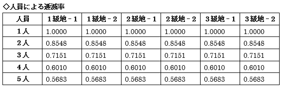 同じように年齢による支給金額表に級地区分と年齢を当てはめて該当する基準額を世帯人員で合計し、人員による逓減率(ていげんりつ)を掛け、世帯人数による支給金額表に級地区分と人員を当てはめ、基準額を足して生活扶助基準(第1類+第2類)②を算出します。