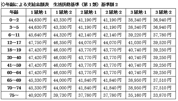 家賃や物価の違いから、住んでいる地域により生活水準が異なることから、級地によって支給額に差を設けています。